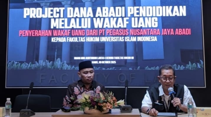 beritabernas.com – FH UII menerima wakaf uang sebesar Rp15 Juta dari PT Pegasus Nusantara Jaya Abadi untuk Dana Abadi Pendidikan, Kamis 9 Oktober 2025. Penyerahan uang wakaf tersebut dilakukan di di Ruang Mini Auditorium Lantai 4 FH UII.