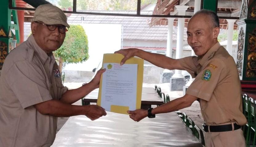 Ketua Ikasata Ki Tri Suparyanto (kiri) menyerahkan dokumen administrasi bantuan air bersih kepada Lurah Serut Sugianto, Selasa 7 Oktober 2025. Foto: Dok Ikasata