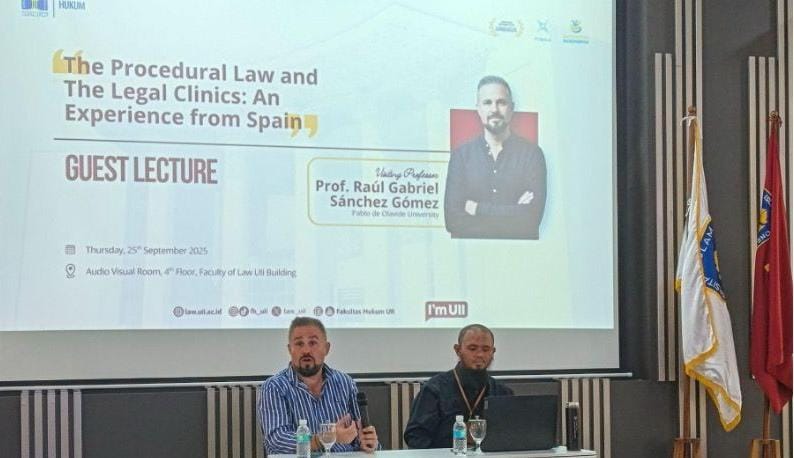 “Saat ini kami juga membuka spesialisasi klinik hukum dan dibuka untuk program S1, S2, dan juga S3,” kata Prof Raúl Gabriel Sánchez Gómez dari Pablo de Olavide University, Spanyol, dalam kuliah tamu yang diadakan oleh International Program, FH UII di Ruang Audiovisual Lantai 4 Kampus FH UII, Kamis 25 September 2025.