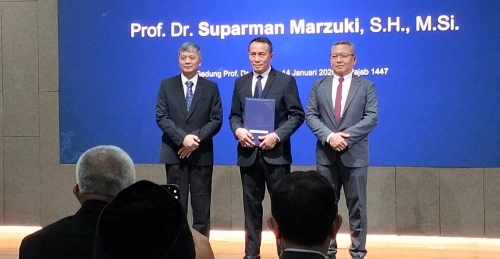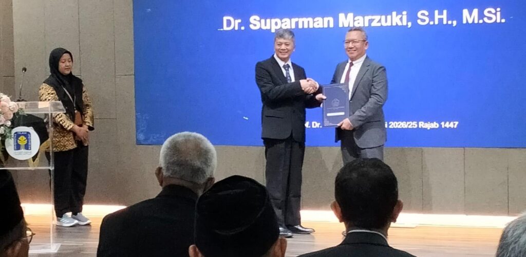 beritabernas.com – Dosen FH UII yang juga Ketua Komisi Yudisial (KY) RI periode 2013-2015 Dr Suparman Marzuki meraih jabatan akademik Profesor atau Guru Besar di bidang Ilmu Hukum dan Hak Asasi Manusia (HAM). Penyerahan SK Kenaikan Jabatan Akademik Profesor dari Kementerian Pendidikan Tinggi dan Ristek ini dilakukan secara simbolis oleh Kepala Lembaga Layanan Pendidikan Tinggi (LLDikti) Wilayah V DIY Prof Setyabudi Indartono MM PhD kepada Rektor UII Prof Fathul Wahid ST MSc PhD untuk selanjutnya diserahkan kepada Prof Suparman Marzuki di Ruang Datar Lantai 2 Gedung Kuliah Umum (GKU) Sardjito Kampus Terpadu UII, Rabu 14 Januari 2026.