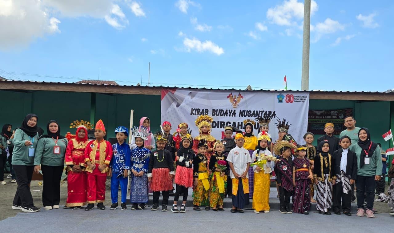 beritabernas.com – SD Negeri Caturtunggal 4 Depok, Sleman menggelar Kirab Budaya Nusantara menyambut HUT ke-80 Kemerdekaan RI, pada Jumat 15 Agustus 2025.