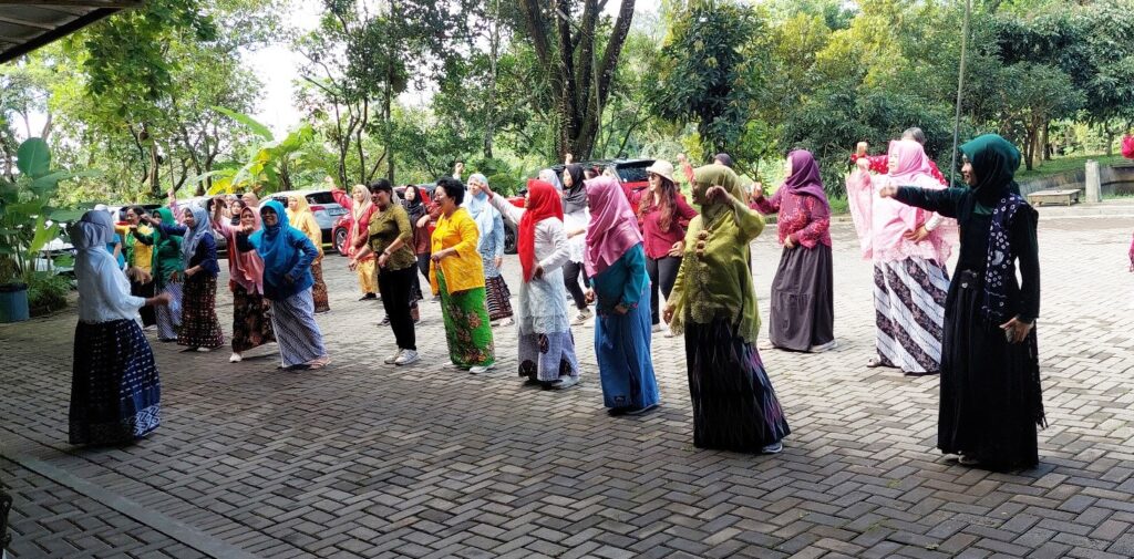 Dengan berkebaya model zaman kini, enampuluhan ibu memulai kegiatan jalan gembira mengitari area persawahan dan perkebunan, serta melanjutkannya dengan senam ringan bersama diiringi pemusik yang diundang khusus untuk acara ini.