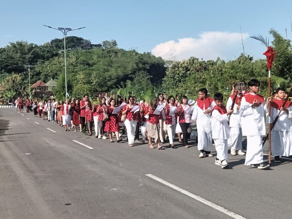 beritabernas.com – Ratusan umat Katolik Gereja Santo Yohanes Pembaptis Payak, Dusun Bintaran Wetan, Kelurahan Srimulyo, Piyungan, Bantul, Daerah Istimewa Yogyakarta mengikuti perarakan Minggu Palma. Perarakan dimulai dari pendopo kelurahan menuju gereja.